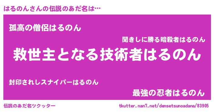 | 意味不明あだ名 | 『ニラ科はるのん属』『自称はるのん』 |