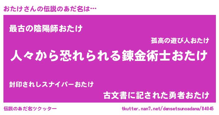 | 男性向けラノベタイトル風あだ名 | 『オタケスレイヤー』『魔弾の王とおたけ』 |