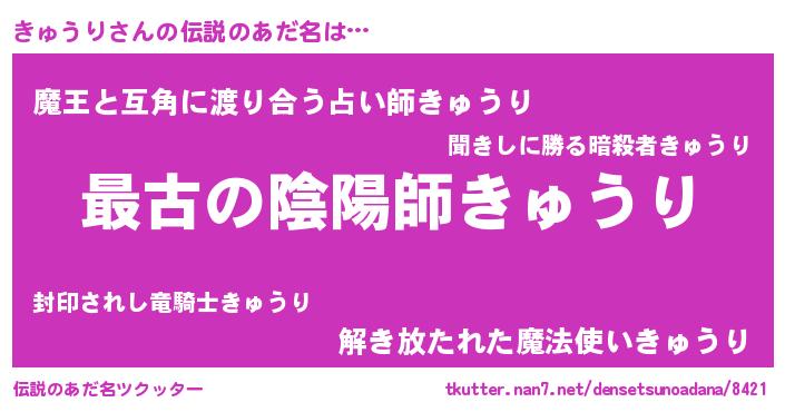 | ヒーロー風カッコイイあだ名 | 『ウルトラきゅうりマン』『魔戒騎士キュ』 |