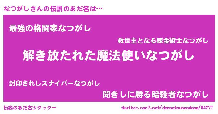 | 男性向けラノベタイトル風あだ名 | 『なつがしに滅ぼされるだけの簡単なお仕事です』 |