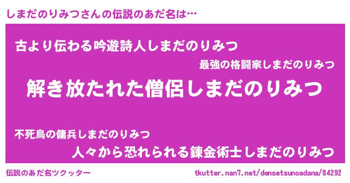 | 男性向けラノベタイトル風あだ名 | 『しまだのりみつの嫁は女の子じゃないと思った?』 |