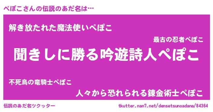 | 男性向けラノベタイトル風あだ名 | 『ぺぽこという概念が存在しない退屈な世界 』 |