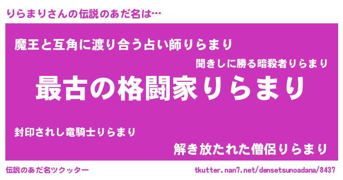 | 意味不明あだ名 | 『住所不定無職りらまり(4歳)』 |