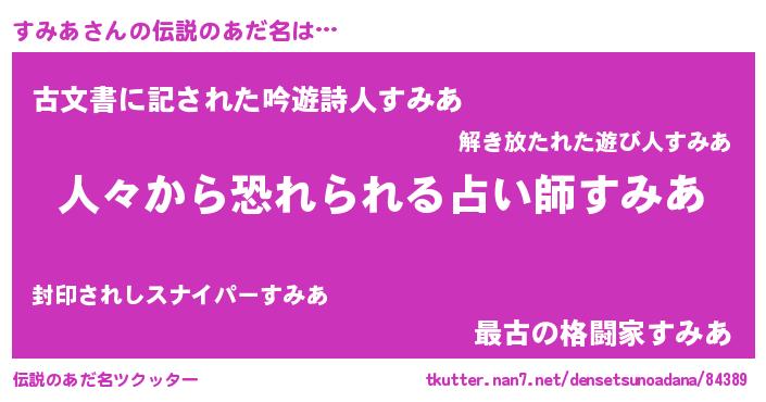 | 男性向けラノベタイトル風あだ名 | 『おまえをオタクにしてやるから、俺をすみあにしてくれ! 』 |