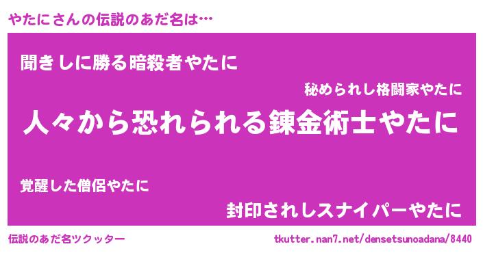 | 男性向けラノベタイトル風あだ名 | 『おまえをオタクにしてやるから、俺をやたににしてくれ! 』 |