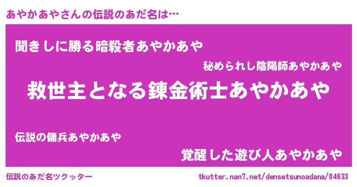 | ヒーロー風カッコイイあだ名 | 『慈愛の使者あやかあや』『仮面アヤダー』 |
