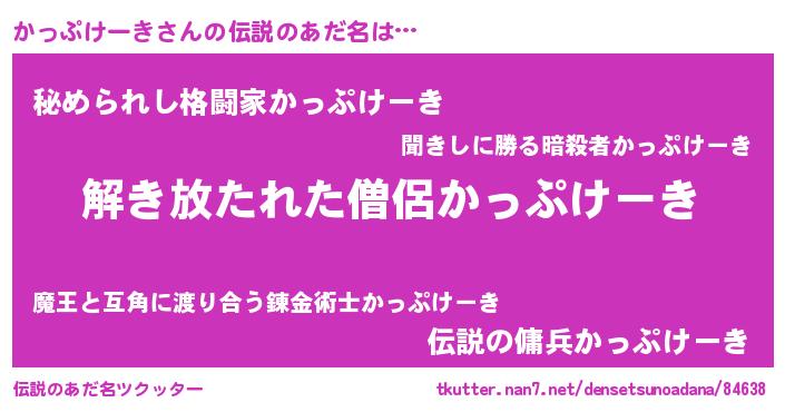 | 男性向けラノベタイトル風あだ名 | 『かっぷけーきの嫁は女の子じゃないと思った?』 |
