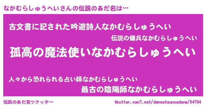 | 男性向けラノベタイトル風あだ名 | 『ナカムラシュウヘイスレイヤー』 |