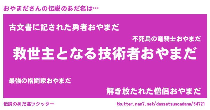 | 男性向けラノベタイトル風あだ名 | 『Re:おやまだから始める異世界生活』 |