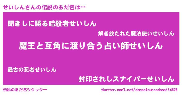 | ヒーロー風カッコイイあだ名 | 『慈愛の使者せいしん』『ネオセイシン』 |