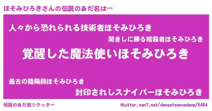 | 男性向けラノベタイトル風あだ名 | 『ほそみひろきの嫁は女の子じゃないと思った?』 |