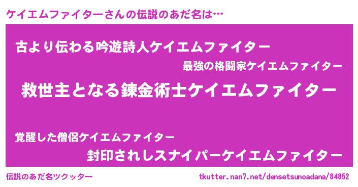 | 男性向けラノベタイトル風あだ名 | 『この素晴らしい世界にケイエムファイターを!』 |