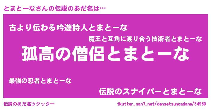 | 意味不明あだ名 | 『自称とまとーな』『永久保存とまとーな』 |