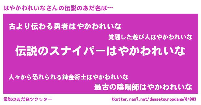 | 男性向けラノベタイトル風あだ名 | 『魔弾の王とはやかわれいな』 |