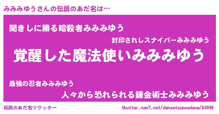 | 意味不明あだ名 | 『自称みみみゆう』『永久保存みみみゆう』 |