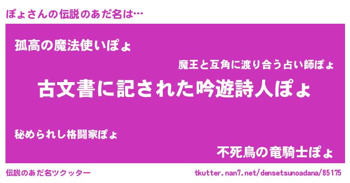 | 男性向けラノベタイトル風あだ名 | 『ぽょ~年齢イコール彼女いない歴の魔法使い~』 |