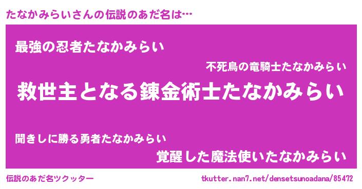 | 意味不明あだ名 | 『住所不定無職たなかみらい(89歳)』 |
