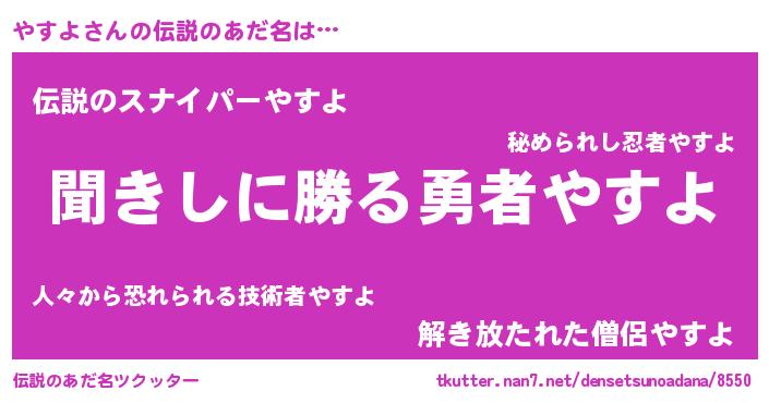 | 男性向けラノベタイトル風あだ名 | 『やすよという概念が存在しない退屈な世界 』 |