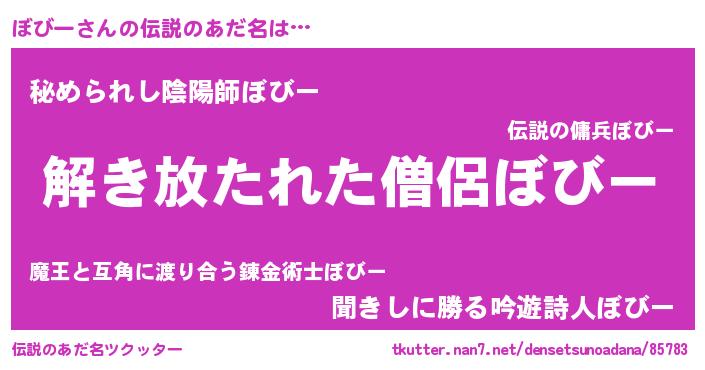 | 男性向けラノベタイトル風あだ名 | 『ダンジョンにぼびーを求めるのは間違っているだろうか』 |