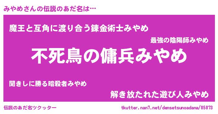 | ヒーロー風カッコイイあだ名 | 『最強戦士ミヤメ』『仮面ミヤダー』 |