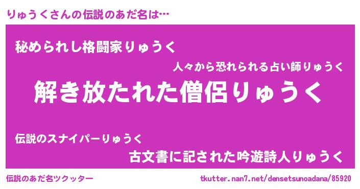| ヒーロー風カッコイイあだ名 | 『銀牙騎士リュ』『ウルトラりゅうくマン』 |