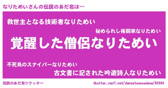 | ヒーロー風カッコイイあだ名 | 『炎刃騎士ナリ』『愛の使者なりためい』 |
