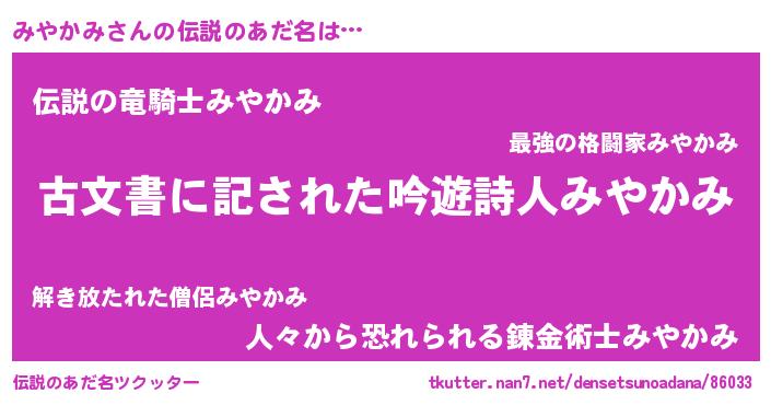 | 意味不明あだ名 | 『永久保存みやかみ』『ペロリンみやかみ』 |