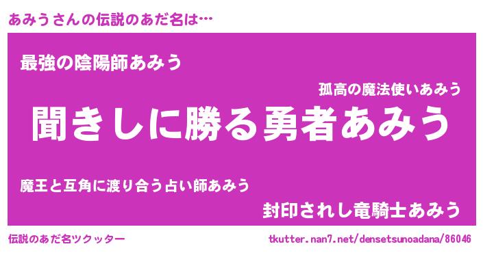 | 女子向けラノベタイトル風あだ名 | 『異世界で失敗しない100のあみう』 |