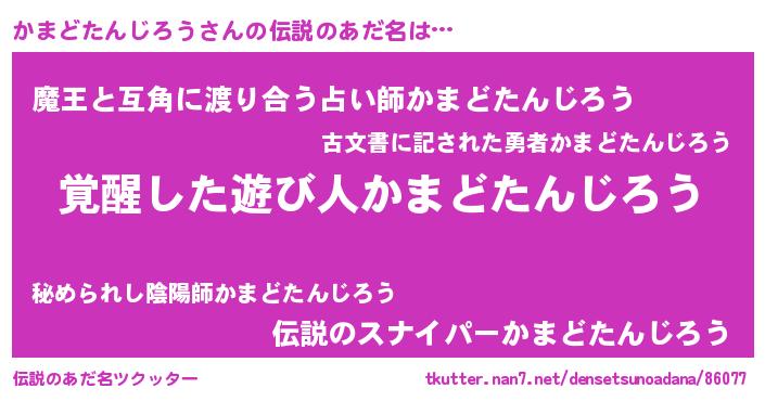 | 男性向けラノベタイトル風あだ名 | 『かまどたんじろうの嫁は女の子じゃないと思った?』 |
