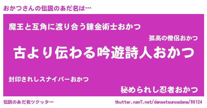 | 女子向けラノベタイトル風あだ名 | 『乙女ゲームの破滅フラグしかない悪役おかつに転生してしまった…』 |