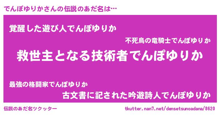 | 男性向けラノベタイトル風あだ名 | 『Re:でんぽゆりかから始める異世界生活』 |