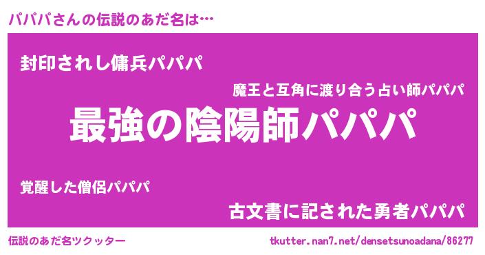 | 男性向けラノベタイトル風あだ名 | 『うちの娘の為ならば、俺はもしかしたらパパパも倒せるかもしれない。』 |