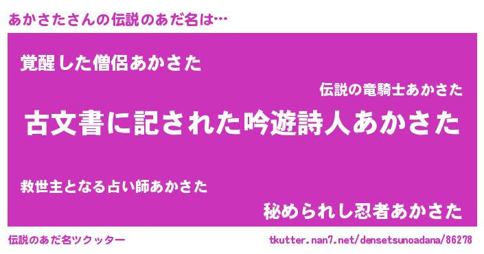 | 意味不明あだ名 | 『永久保存あかさた』『自称あかさた』 |