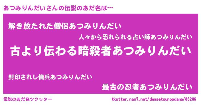 | 男性向けラノベタイトル風あだ名 | 『転生したらあつみりんだいだった件』 |