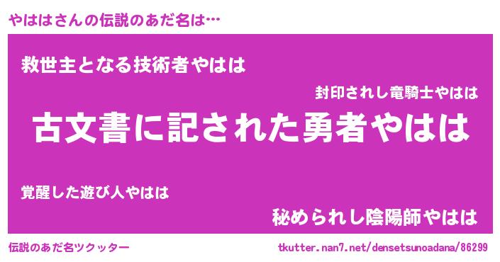 | 意味不明あだ名 | 『住所不定無職やはは(98歳)』『自称やはは』 |