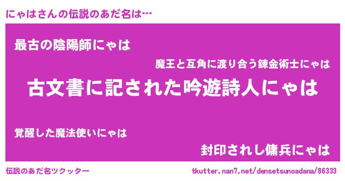 | 男性向けラノベタイトル風あだ名 | 『にゃはに滅ぼされるだけの簡単なお仕事です』 |