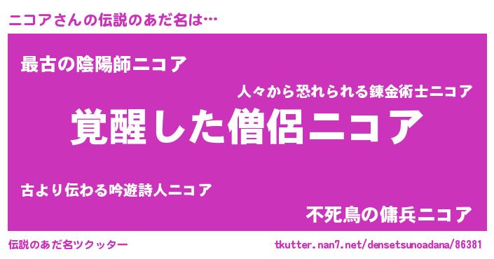 | 意味不明あだ名 | 『とにかく怪しいニコア』『自称ニコア』 |