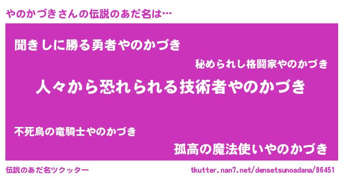 | 男性向けラノベタイトル風あだ名 | 『ヤノカヅキスレイヤー』 |