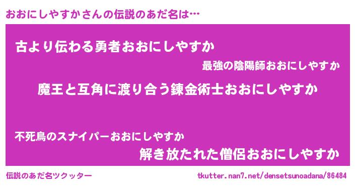 | 男性向けラノベタイトル風あだ名 | 『Re:おおにしやすかから始める異世界生活』 |