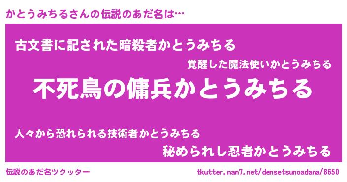 | 女子向けラノベタイトル風あだ名 | 『かとうみちる姫と円卓の騎士』 |