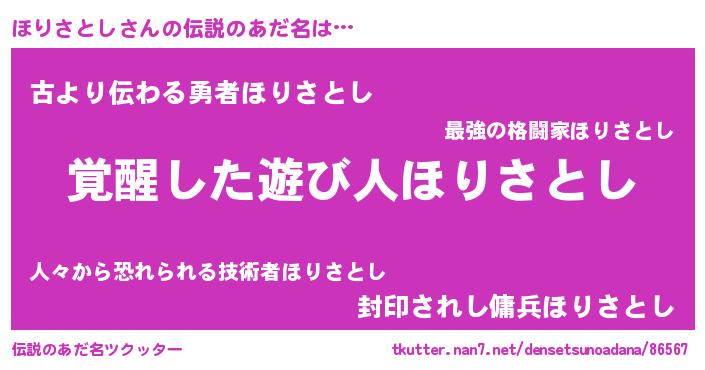 | 男性向けラノベタイトル風あだ名 | 『ほりさとし~年齢イコール彼女いない歴の魔法使い~』 |