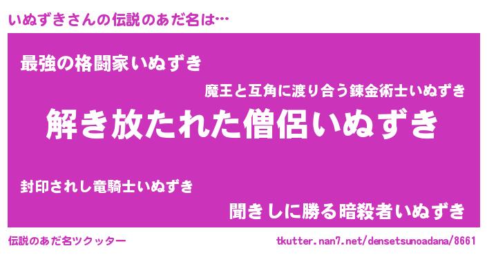 | 女子向けラノベタイトル風あだ名 | 『いぬずきの卵を拾いまして』 |