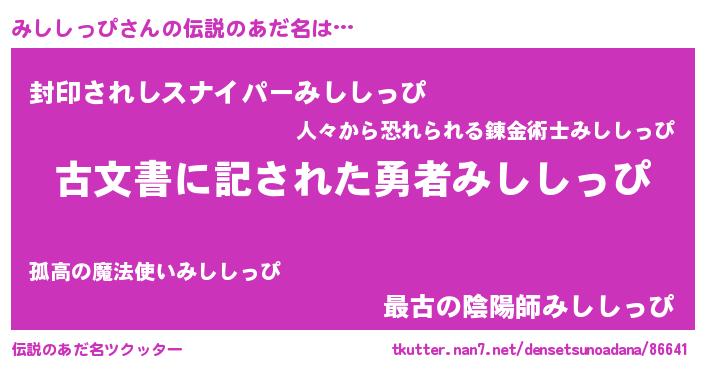 | 意味不明あだ名 | 『自称みししっぴ』『永久保存みししっぴ』 |