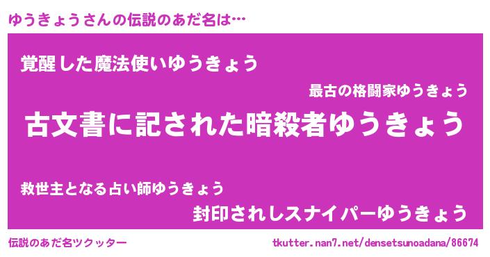 | 男性向けラノベタイトル風あだ名 | 『ゆうきょう~年齢イコール彼女いない歴の魔法使い~』 |