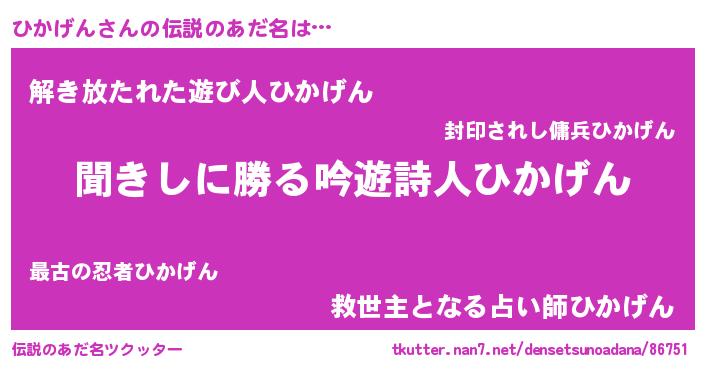 | 意味不明あだ名 | 『住所不定無職ひかげん(9歳)』 |