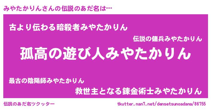 | ヒーロー風カッコイイあだ名 | 『暗黒騎士ミヤ』『最強戦士ミヤタカリン』 |