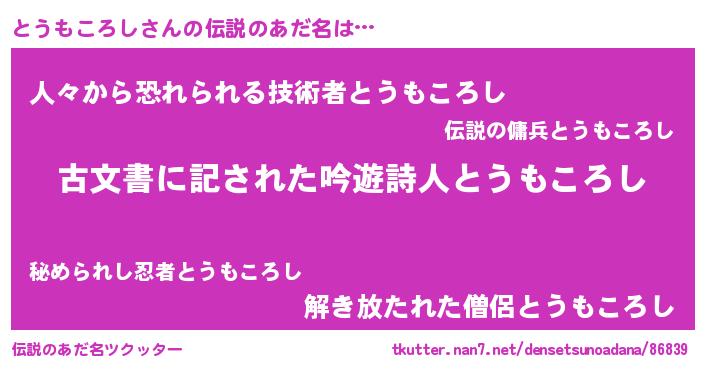 | ヒーロー風カッコイイあだ名 | 『究極戦士トウモコロシ』『銀牙騎士トウ』 |