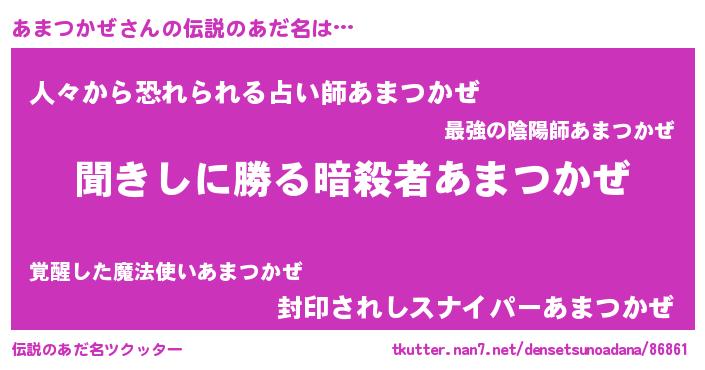 | 意味不明あだ名 | 『永久保存あまつかぜ』『自称あまつかぜ』 |