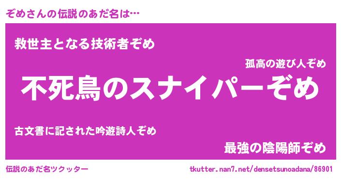 | 男性向けラノベタイトル風あだ名 | 『ぞめに滅ぼされるだけの簡単なお仕事です』 |