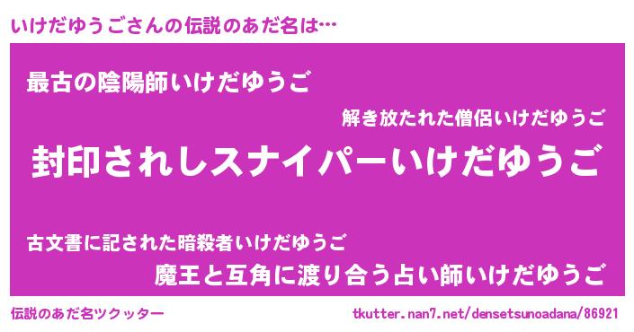 | 男性向けラノベタイトル風あだ名 | 『いけだゆうご~年齢イコール彼女いない歴の魔法使い~』 |